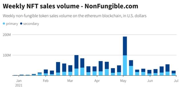不过,热浪还在延续。数据显示,“Rarible”、“Opensea”这些主要NFT交易平台的销售额,在今年第二季度,增长了50到100倍。其中,Opensea的累计销售额已经超过1亿美元。